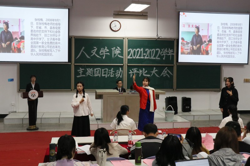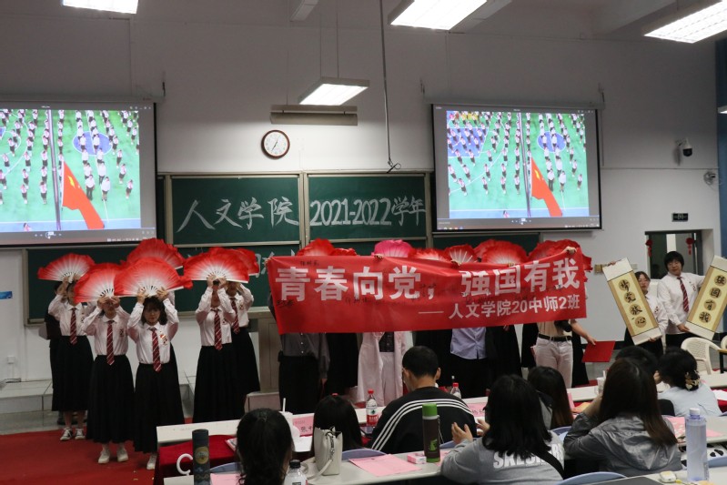 各团支部带来了精彩的汇报表演,21中文1班的光影戏,利用光影幕布带领观众回顾了党的百年征程;20文博2班结合专业特色,进行话剧表演,创新的形式展现了敢于担当的时代青年形象。19中文1班的表演将手语与舞蹈演唱相结合,利用吉他进行伴奏,传达了矢志不渝跟党走的信念。19中师2班以朗诵的形式,跨越时空,对话巾帼英雄,声情并茂地表达了“同心向党,砥砺前行”的主题。朗诵声声,诉说时代苍茫,歌舞阵阵,赞颂党的华章。回忆红色路上,展现时代之光!