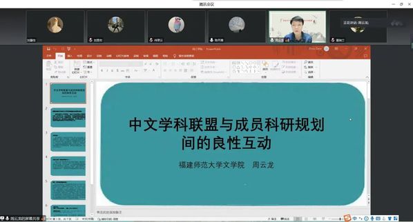 为了做好公司中国语言文学一级学科的培育工作,提升教师学术水平,加强校际地方性课题的联盟研究,攻关重要的课题申报,2022年11月2日,公司特邀请福建师范大学文公司分管科研工作的副经理周云龙教授于腾讯会议开设题为《中文学科联盟与成员科研规划间的良性互动》的线上讲座。本次讲座由中文系系主任陈开晟老师主持。