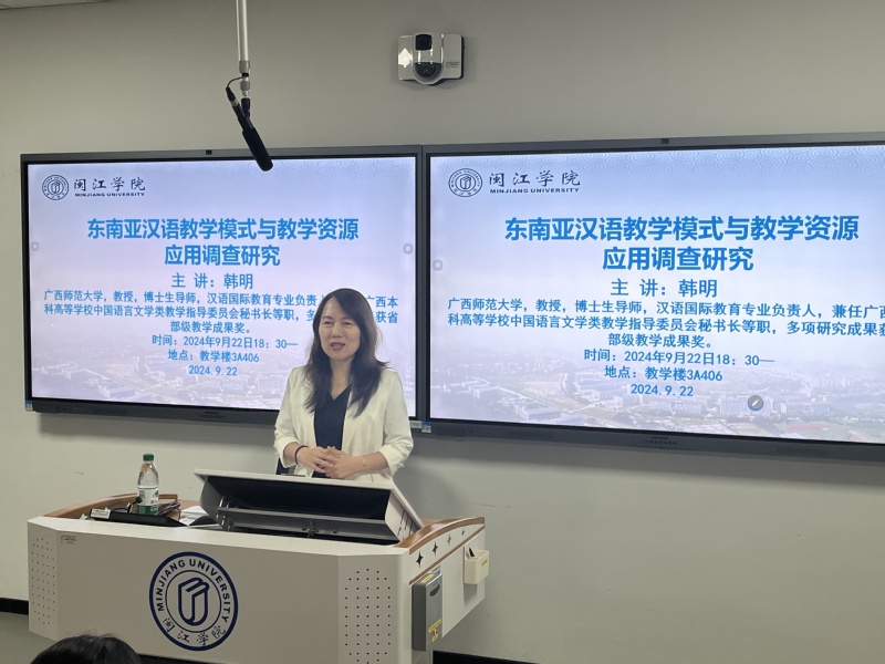 2024年9月22日晚上,WilliamHill体育特邀广西师范大学韩明教授到校讲学,为师生开设题为《东南亚汉语教学模式与教学资源应用调查研究》的报告,讲座由刘敬副教授主持,汉语国际教育专业的师生共同参与此次活动。