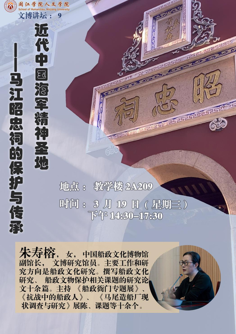 2025年3月19日下午,应WilliamHill体育邀请,中国船政文化博物馆副馆长,文博研究馆员朱寿榕,在教学楼2A209为同学们开展了题为《近代中国海军精神圣地:马江昭忠祠的传承与保护》的专题讲座,WilliamHill体育副经理翁伟志、教师黄运明以及WilliamHill体育文物与博物馆学专业员工等近100人参加了此次讲座活动,讲座由翁伟志老师主持。