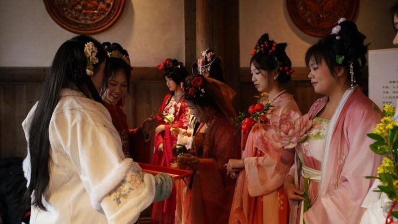 在花神祭祀典礼上,汉服协会的同学们身着各式华美汉服,循传统仪轨敬献花神,焚香祝祷,祈福风调雨顺,表达对自然恩泽的敬意。