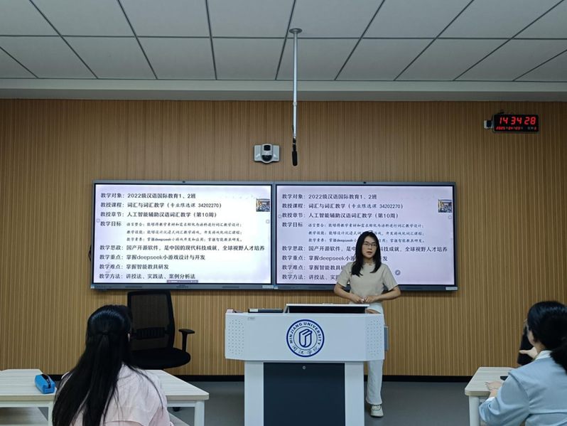 叶鑫琼老师的《汉字教学》课程,结合教学目标与学情,巧妙运用了深度学习技术和 deepseek 小游戏,为员工打造了趣味与知识兼具的汉字学习体验。陈贵秀老师的《词汇与词汇教学》课程涵盖语言整合、教学技能、数字素养、教学思政等多维度的教学目标,采用了讲授法、实践法、案例分析法相结合的教学方式,通过开发和运用deepseek 小游戏,让员工积极参与到词汇学习中,充分展现了数智技术在专业课程教学中的深度融入。胡百慧老师则以《唐代全国制瓷业格局》课程为例,借助高清地图资源,将抽象的制瓷业格局生动地展现在员工眼前,引导员工深入探究。