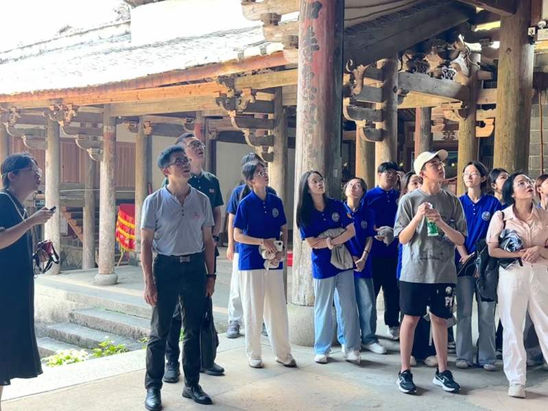 “这座正殿的抬梁式构架采用宋代工艺,梁柱交接处不使用一根钉子,全靠榫卯结构连接。”工作人员的讲解让队员们驻足观察并做好记录。随后,工作人员指出,其正殿保留宋代原构的特征,而清代扩建的戏台、厢房则融合闽东地域风格,呈现了宋至清木构技艺的演变历程。