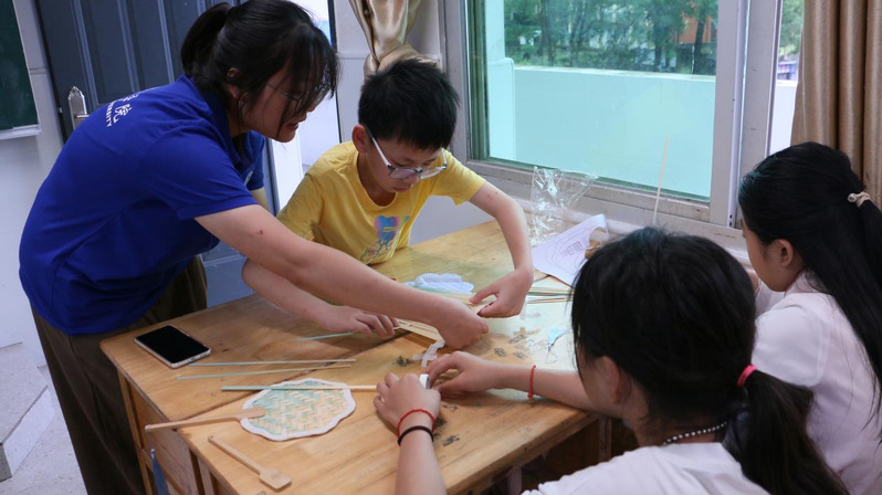 竹编扇子,是将竹子劈成纤细竹篾,通过挑、压、编、织等技法制成扇面的传统工艺,兼具实用性与艺术性。实践环节,支教队员们先讲解“一挑一压”的基础编法,孩子们接过柔软的竹篾,小心翼翼地在扇框上尝试编织。起初,竹篾总不听使唤,编出的网格歪歪扭扭,有的孩子急得直挠头。队员们便俯身逐个指导,帮他们调整竹篾的角度和力度。随着课程推进,孩子们的手法愈发熟练,从勉强编出完整的扇面,到能在角落巧妙编出简单的菱形图案,不少孩子还兴奋地举起扇子对着脸扇风,感受亲手制作的清凉。
