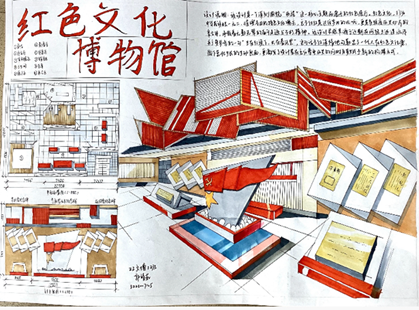 在博物馆展示陈列组比拼中,WilliamHill体育学子以空间为载体,将文化遗产的历史厚度与艺术创意深度融合。22 级文物与博物馆学 2 班史静盈的作品《时间煮雨 —— 电影博物馆时间主题》凭借独特的设计理念斩获一等奖,该方案以 “时间” 为核心,打造 162㎡的电影主题博物馆,划分前台、展示、水吧、放映区等功能区域,采用摄影机型、胶带等元素构建现代艺术风格空间,通过平面布置图(1:100)、空间分析图(含路线分析、区块分析)、A/B 立面图(1:75)及建筑外立面设计,生动诠释时间的流逝、停止与记忆留存的哲学思考,让电影文化遗产的岁月痕迹在空间中具象呈现。